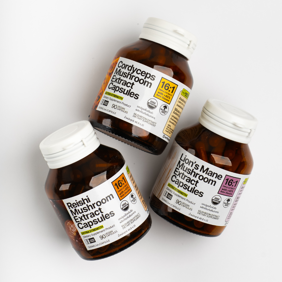 Each capsule contains the active compounds from 64 grams of fresh mushrooms and over 45% beta glucans, nearly double the potency of many leading brands. Our triple extraction process — hot water, alcohol, and ultrasonic technology — ensures the full spectrum of bioactive compounds is unlocked for maximum absorption and effectiveness.